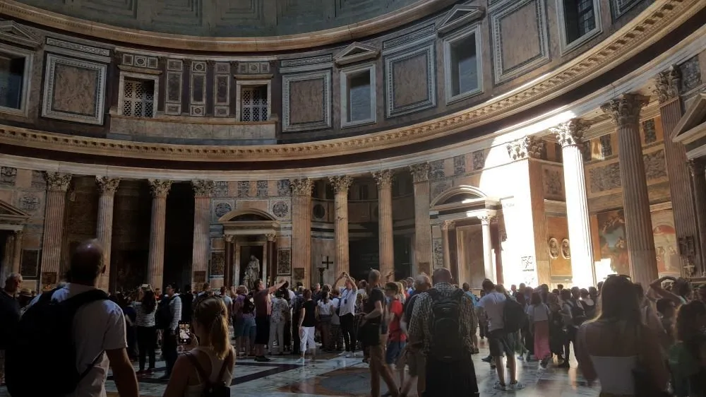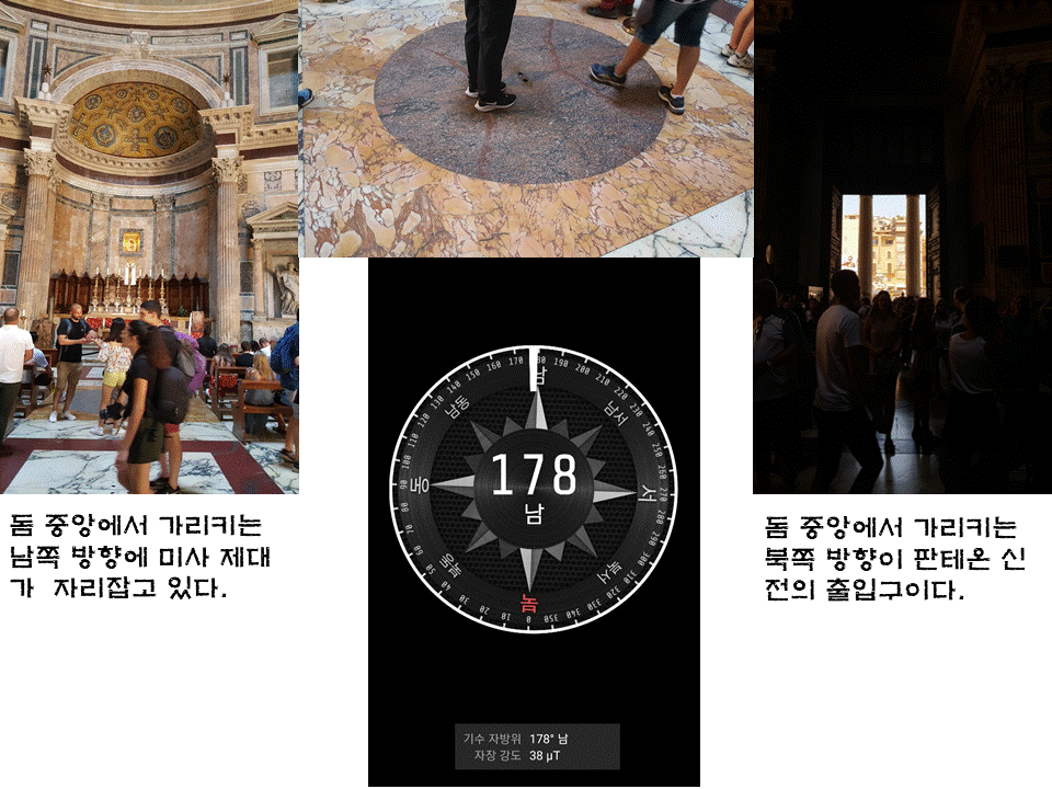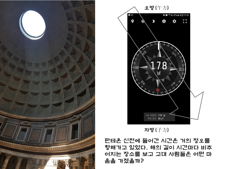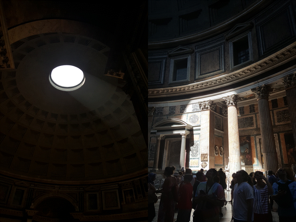 서양의 가톨릭 수행자들은 그 빛을 보기 위해 애써서 동굴을 찾아 들어갔고 더 고대의 로마인들은 일부러 빛이 들어오는 인공 동굴을 시내 한복판에 판테온이란 이름으로 만들어서 시민들이 신(빛)의 모습을 관찰하도록 한 것일까? 내가 판테온 신전에 들어갔을 때가 정오로 향하는 11시 30분 즈음이었다. 남동쪽으로부터 북서쪽 영역에 빛이 비추어지고 있다. 이렇게 해가 움직이면서 빛이 들어오는 지역마다 되비치는 영혼의 모습도 다양할 것이다.