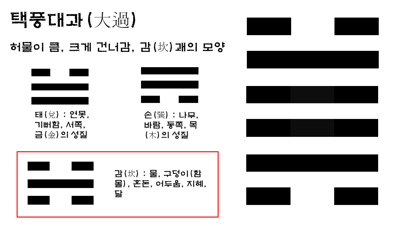 서쪽을 상징하는 태(兌)괘와 동쪽을 상징하는 손(巽)괘는 태양이 지고 뜨는 경로를 암시한다. 이는 어찌보면 동서로 매일 순환하면서 살아가는 우리의 인생살이를 암시하는 것일지도 모르겠다. 서쪽에서 동쪽으로 간다함은 어두컴컴한 밤의 시작을 알린다. 그러나 해는 쉼없이 움직이고 있다. 대과(大過)괘의 전체 모양을 보면 감(坎)괘를 닮았다. 감괘는 물, 어두움, 혼돈을 상징한다. 우리의 인생살이는 힘들고 고단하다. 그렇지만 그러한 시련이 있기에 빛을 머금은 존재인 우리의 영적 성장이 가능한 것이다. 큰 바다를 건너가듯이 실수를 계속하면서 반성하고 다시 가고 또 가는 것을 멋지게 표현한 것이 바로 대과(大過)괘이다.