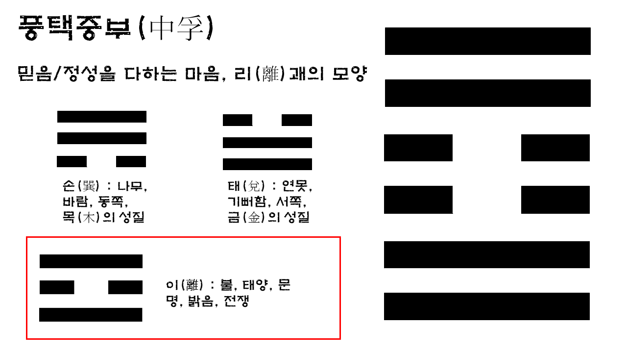 중부(中浮)괘의 모양은 태양을 상징하는 이(離)괘를 닮았다. 밝은 지혜를 가지고 살아가라는 의미이다. 그래서 우리는 깨끗하고 정성스런 마음의 빛을 항상 품고 살아가야 하고 노력해야할 것이다. 중부괘는 어미새가 알을 정성스럽게 품고 있는 형상을 나타내기도 한다.  대과(大過)의 음양을 전부 바꾸면 중부(中浮)괘가 된다. 동쪽의  손(巽)괘와 서쪽의 태(兌)괘가 자리바꿈하였다. 동-서-동-서로 순환되어 뜨고 지는 태양의 변하지 않는 은총이 있기에 우리는 살아갈 수 있는 것이다. 해는 다시 떠오르기에 믿음이 있고 그로부터 어김없이 실패(어둠)를 딛고 일어서서 다시 건너가라는 정성스러움을 상징하는 것일까? 다시금 판테온 신전의 돔에서 비추어주는 해의 길을 바라본다. 그리고 28가지의 대과(大過) 인생사.