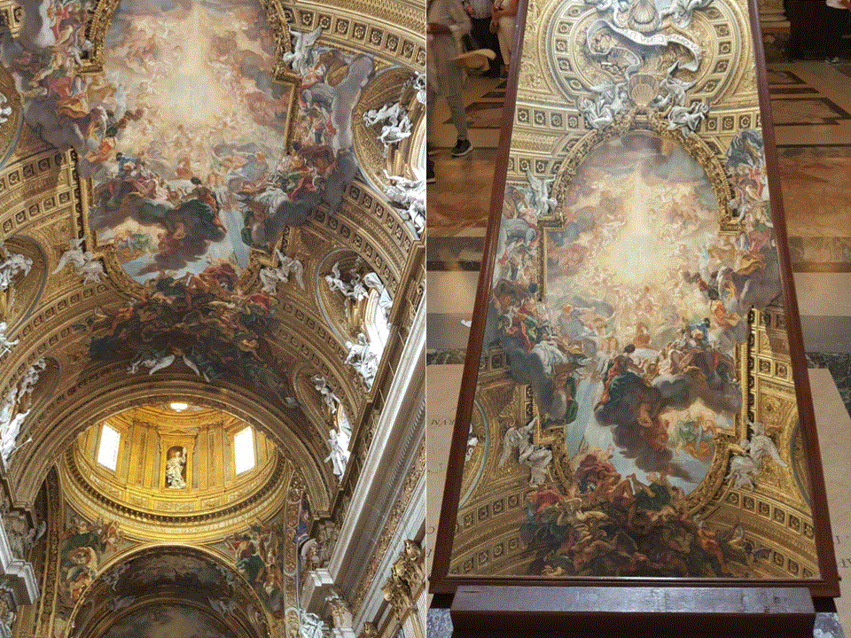 성 이냐시오 성당(Chiesa Di S. Ignazio Di Loyola A Campo Marzio)에 들어가면 거울이 설치되어 있다. 사람들이 모여서 그 거울을 보는 것이 궁금했다. 천장이 되비친 모습을 보라고 놓아둔 것 같다. 목을 뒤로 젖혀 보기 불편할 것이니 이렇게 살펴보라는 배려인지 아니면 다른 철학적 의도가 있는지 모르겠다. 불편한 것을 배려한 것이라면 실패다. 비교하기 위하여 고개를 젖혀 다시 보면서 확인하는 것이 인간의 당연한 습성이기 때문이다. 거울 속에 비친 천장의 되비침을 본 순간 주역의 천택리(天澤履)와 택뢰수(澤雷隨)의 괘상(卦象)이 떠올랐다.