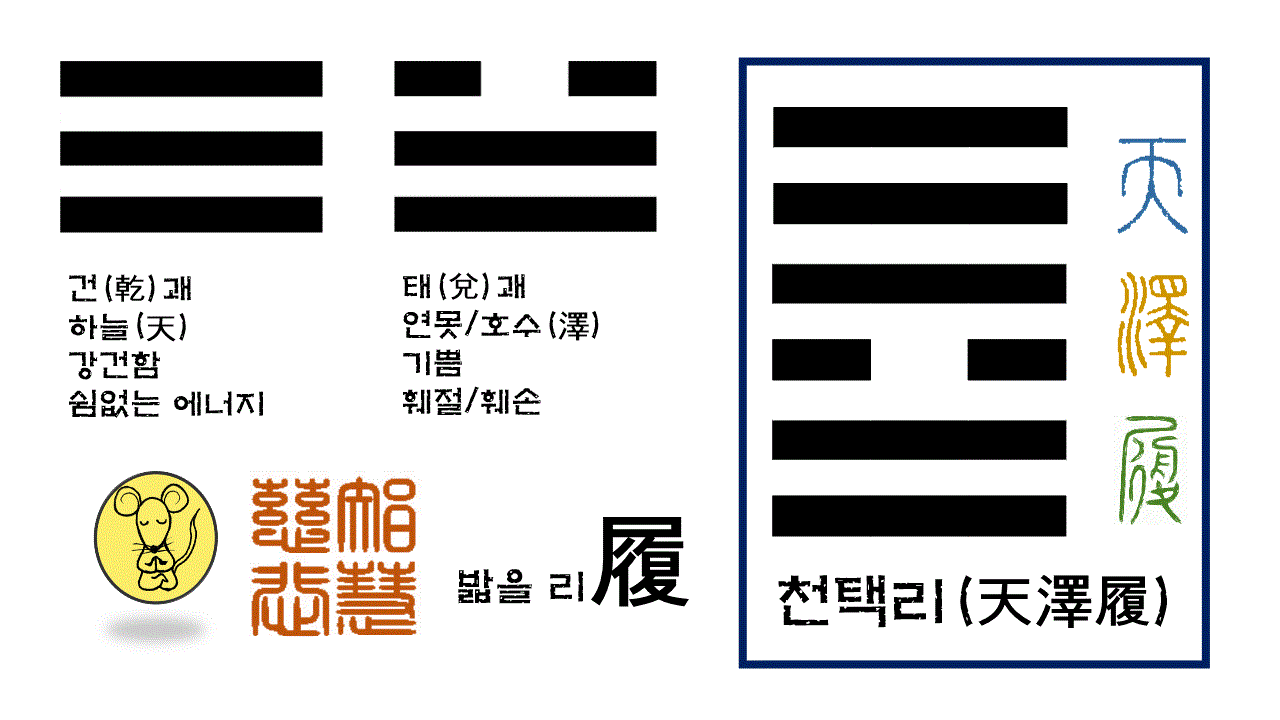 천택리(天澤履)괘는 하늘에 되비쳐진 호수를 표상한다. 맑은 호수는 하늘을 그대로 복사한다. 상괘의 건(乾)은 하늘을, 하괘의 태(兌)는 호수를 상징한다. ‘리(履)’는 밟는다는 의미인데, 파자하면 ‘주검’ 시(尸)와 ‘다시’ 복(復)이다. 풀어쓰면, ‘죽음의 반복됨’이다. 단어의 모양이 이미 윤회를 암시하는 것일까? 카르마의 법칙에 따라 돌고 도는 인생, 전생(과거윤회를 믿지 않더라도 과거를 기억하고 살아가는 사람이라면 윤회하는 삶과 무엇이 다를까? 생물학적으로 우리의 세포가 재생과 소멸을 반복한다면 이것도 윤회가 아닐까?)의 행위(업業)가 새겨놓은 마음의 거울을 품은 몸이 걸어가고 있다. 그것이 인생인가보다. 인생을 여행에 비유하곤 한다. 여행자는 머무는 곳에 집착하지 않는다. 그러나 우리는 그 인생에 집착한다. 주역 괘사에는 호랑이 꼬리를 밟는 마음으로 조심조심하게 살아가라고 권고한다. 태(兌)는 풍요의 기쁨(호수) 외에도 훼절/훼손의 의미도 함유하고 있다. 행복은 고통의 씨앗이라고도 하고 그 반대도 마찬가지이다. 100% 인생의 행복은 없다. vice versa! 모두의 행복도 없다. 내가 행복한 만큼 누군가는 불행하다. 그래서 처음부터 끝까지 조화를 강조한 공자는 천택리 괘를 보고 타자와의 관계에서 ‘예의’를 강조하였다. 조심조심하게 살아가는 데에는 예의처럼 조화로운 수단이 또 있을까?