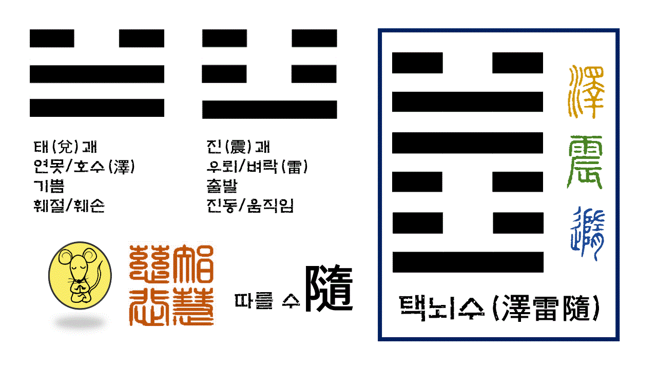 우리는 견해마음의 거울로 판단하는 삶를 가지고 살아간다. 이것이 택뢰수(澤雷隨)의 표상이다. 상괘인 태(兌)는 거울/연못을, 하괘인 진(震)은 움직임 즉, 실천을 상징한다. 우리가 어떤 마음을 가지고 살아가느냐에 따라서 삶은 결정된다. 무심(無心)한 하늘에서 되비쳐진 마음의 이미지에서 우리가 반응하고 결정하는 견해에 따라서 그것이 어떤 결과를 초래하는지를 모르는 체 그것을 쫓아(따를 수隨) 살아간다.
