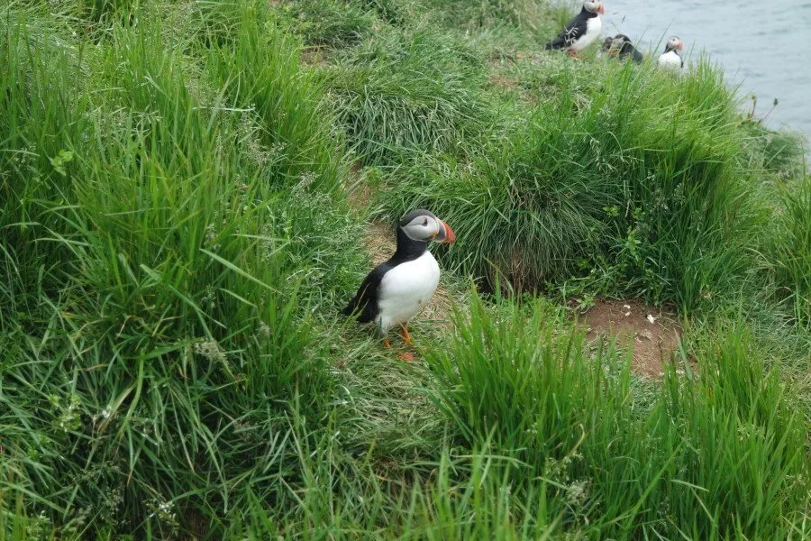 뭐 어쨋든 타이어 교체가 잘 마무리되어 근처에 있는 퍼핀 서식지까지 왔습니다. 이 곳은 마을로부터 1km 남짓 떨어져 있는데요. 의외로 많은 관광객들이 위치를 알고는 찾아오더라고요. Puffins은 참 슬프게 생겼습니다. 꼭 할머니를 떠오르게 하는 생김새를 가지고 있습니다. 기억에 남는 다른 것은 이 서식지 근처에 갈매기들도 사는데, 퍼핀이 생선을 낚시하면 갈매기들을 그것을 지켜보고 있다가 뺏으려고 한다는 점입니다. 퍼핀은 아주 조그마한 굴과 같은 집을 가지고 있는데, 몸집이 상대적으로 큰 갈매기가 들어오지 못하는 집으로 도망치곤 해요.