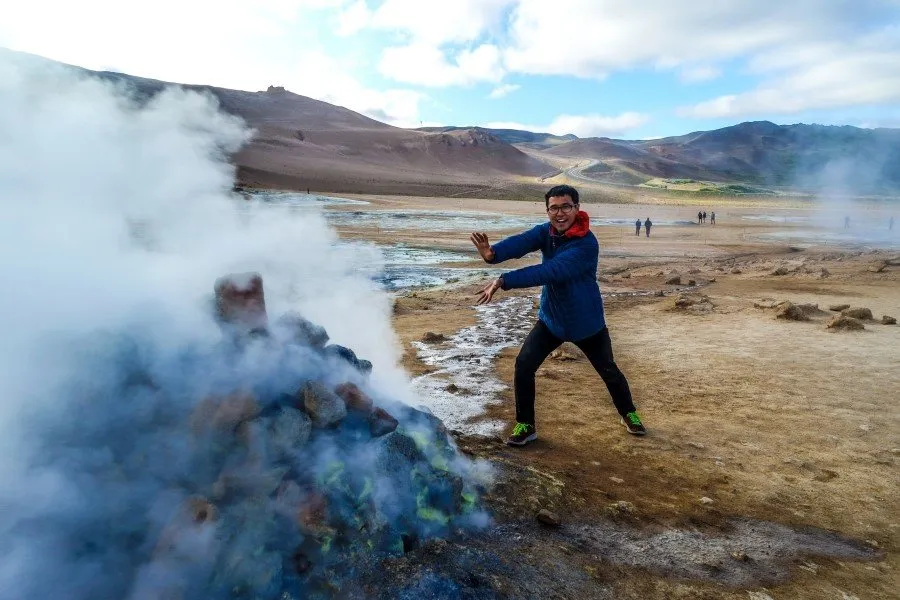 이후에는 근처의 흐베리르(Hvrir)로 갔어요. 땅에서 유황 가스 증기가 무럭무럭 나오는 이 곳은 썩은 달걀을 먹고 뀐 방구 냄새가 나는 그런 곳이에요.