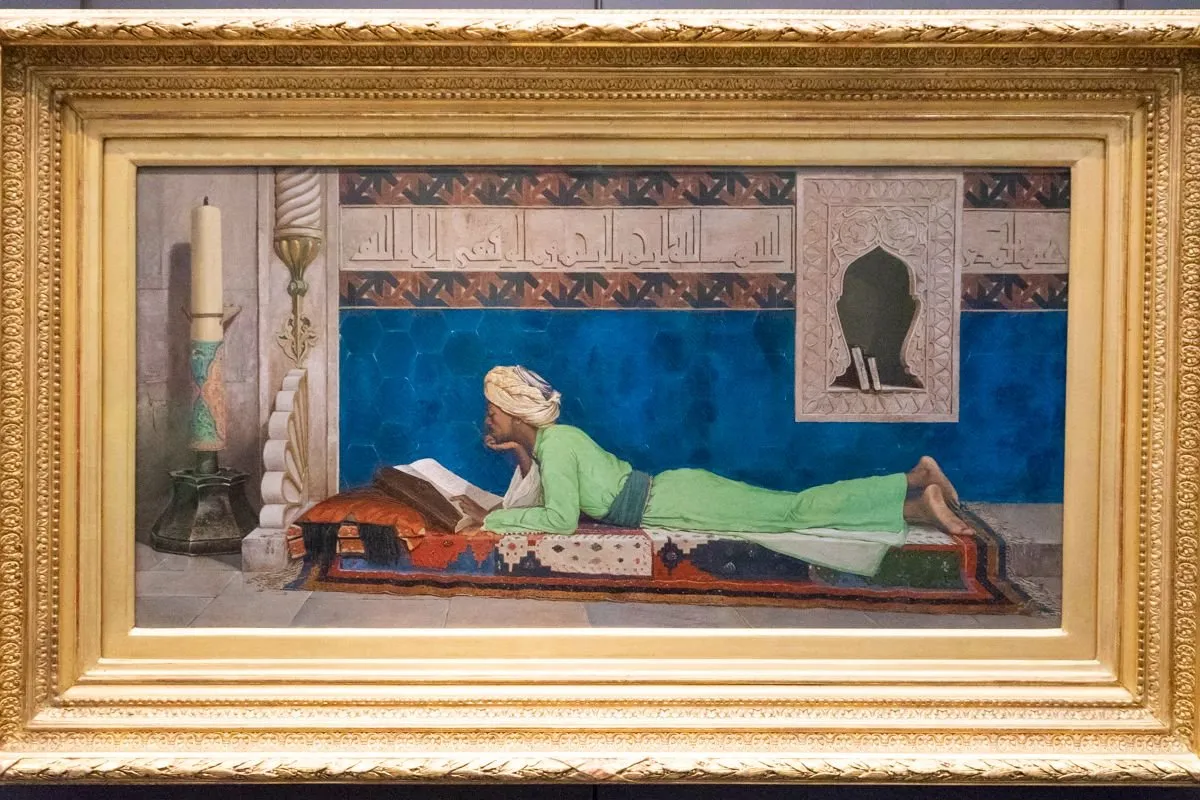나는 미술관이나 박물관을 관람할 때, 가장 갖고 싶은 작품을 마음속으로 선정하곤 한다. 꿈도 꾸지 못할 가격이겠지만, 관람하는 나름의 재미인데 이곳에서 가장 마음에 드는 작품은 이 그림이었다. 어떻게 보면 사진 같기도 하고, 어떻게 보면 수채화 같기도 한 이 그림은 유화인데, 유럽의 화풍과 이슬람 문화가 혼합되어 색다르게 느껴졌다. 다만, 처음 봤을 때는 일반인이 자유롭게 길가에 엎드려 책을 보고 있는 것이라 생각했는데, 제목을 보니 전혀 그런 장면이 아니었다.