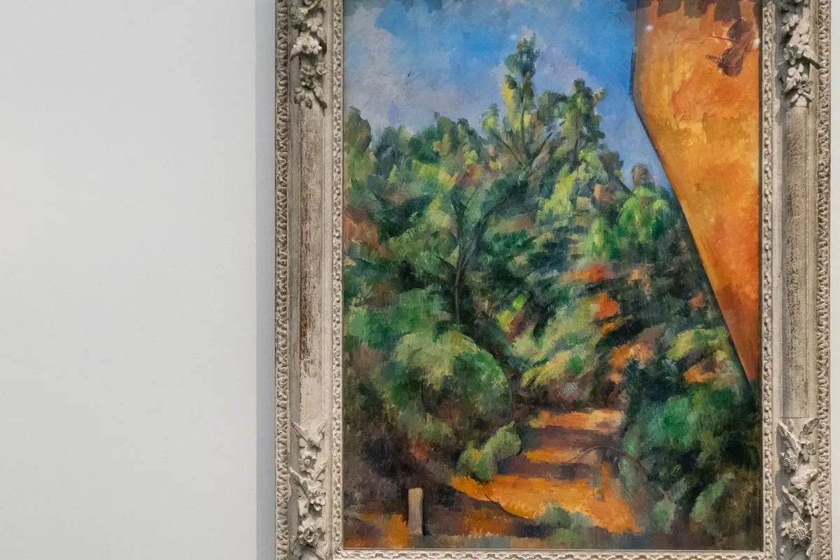 폴 세잔의 이 그림 또한 가까운 것과 멀리 있는 것을 모두 뚜렷하게 그림으로써 원근법에서 탈피하였다. 난데없이 그려진 오른쪽의 붉은 바위는 어딘가 추상적이고 기하학적인 모습으로 보이기도 하는데 이는 이후 등장한 피카소 등의 입체파에게 영향을 주었다.