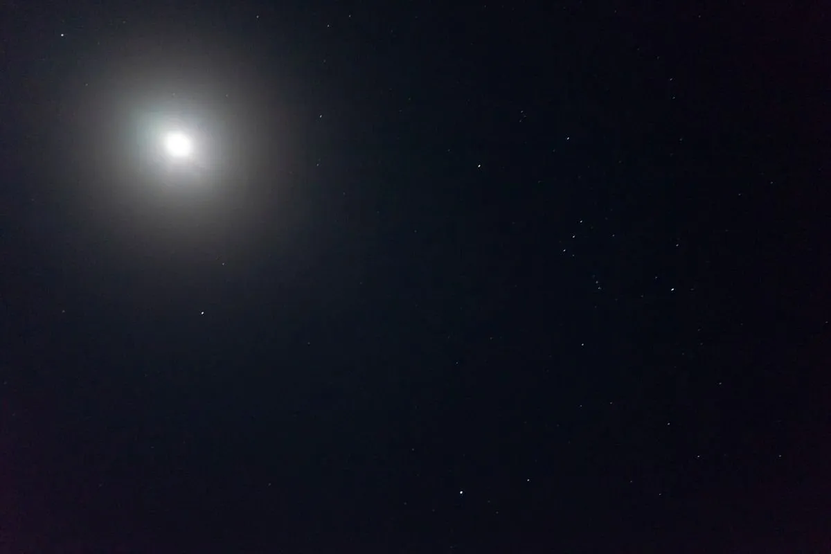 언제까지 걸어야 하는지 모르는 상태로 깜깜한 길을 걷는 동안 내 눈에 들어온 것은 북두칠성, 오리온자리를 포함한 밤하늘의 별이었다. 사진으로 남기고 싶었지만, 삼각대를 숙소에 두고 와 어쩔 수 없이 숨을 참고 별 사진을 찍어 보았는데, 배경과 함께 한 사진은 죄다 흔들리고 대체 어디에서 찍었는지 알 수 없는 별과 달만 존재하는 사진 하나만 건졌다.