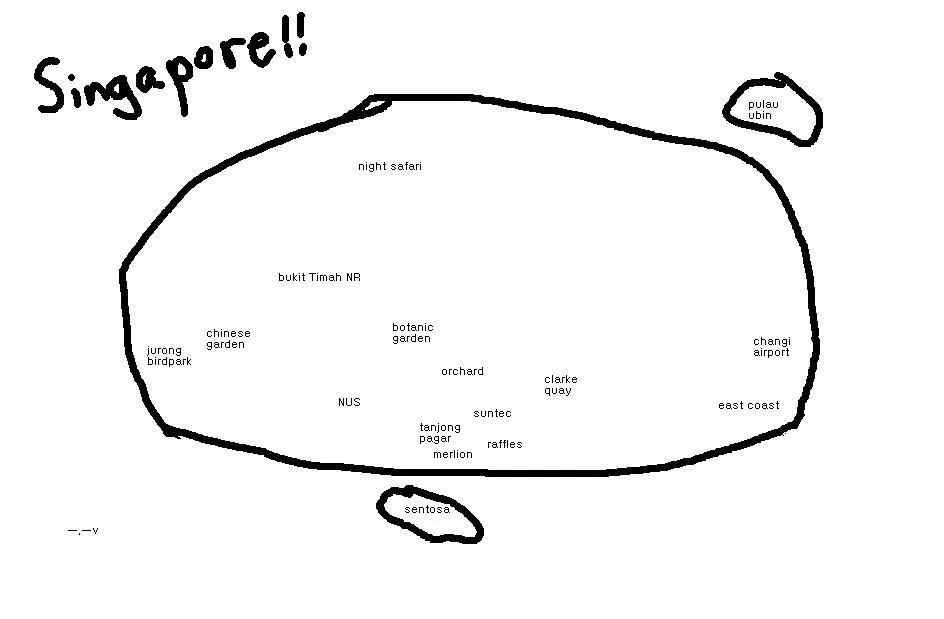 당시엔 구글 맵도 구글 어스도 없었기에, 종이로 된 지도를 보고 대충 갈 곳을 적어서 그에게 보내줬다. 지금 보니까 실제 위치와 거의 비슷하지만, suntec 타워는 잘못된 곳에 적혀있다. 그리고 멀리 있는 night safari와 왜 적었는지 이유를 모르겠는 pulau ubin을 제외하고는 모두 돌아보았다.