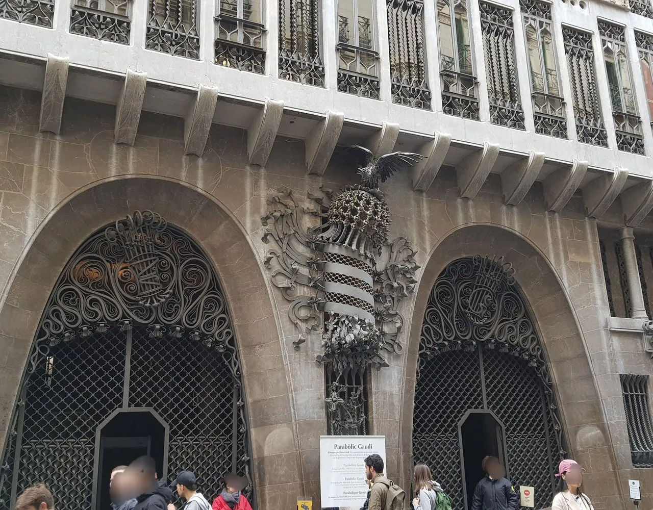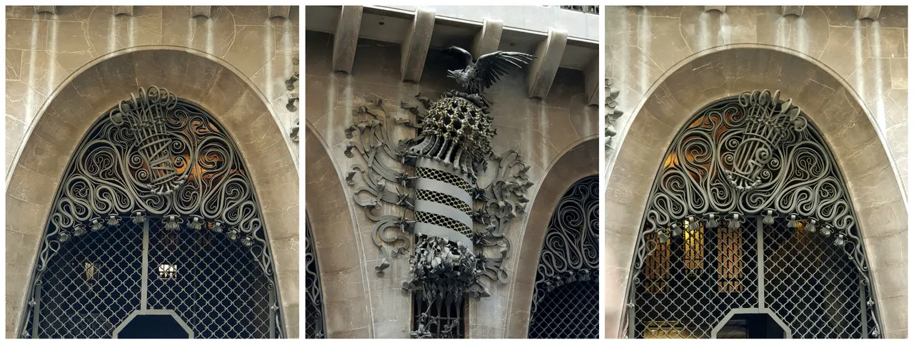 가우디는 금속 주물 장인의 아들이기에 이런 정체성이 느껴지는 금속 장식들은 꼭 있는데요 ~ 파사드 상단부에 알파벳 E와 G는 Eusebi Güell 에우세비 구엘의 이름을 넣은 것이고, 그 뒤에 구불구불한 금속은 끊어지지 않고 다 이어진 하나의 선이라고 합니다. ㄷㄷ 제작하던 분 정말 힘드셨겠....