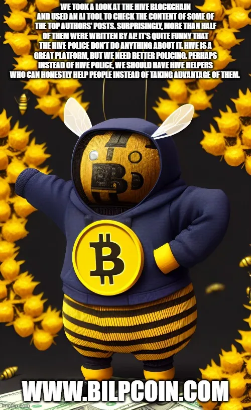 We took a look at the Hive blockchain and used an AI tool to check the content of some of the top authors' posts. Surprisingly, more than half of them were written by AI! It's quite funny that the Hive Police don't do anything about it. Hive is a great platform, but we need better policing. Perhaps instead of Hive Police, we should have Hive Helpers who can honestly help people instead of taking advantage of them.