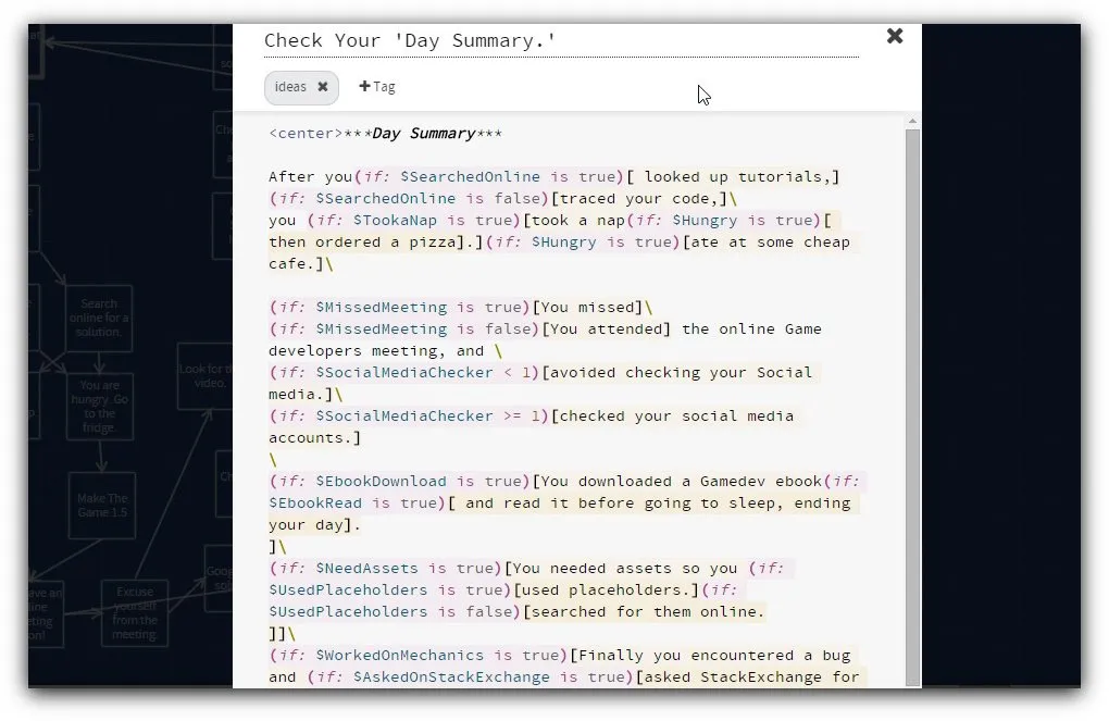 The Summary an additional passage at the end of the interactive fiction that lets players review their play-through, for the sake of the feel "no two playthroughs are the same." To do that I had to add some variables and learn about Twine2 a bit.