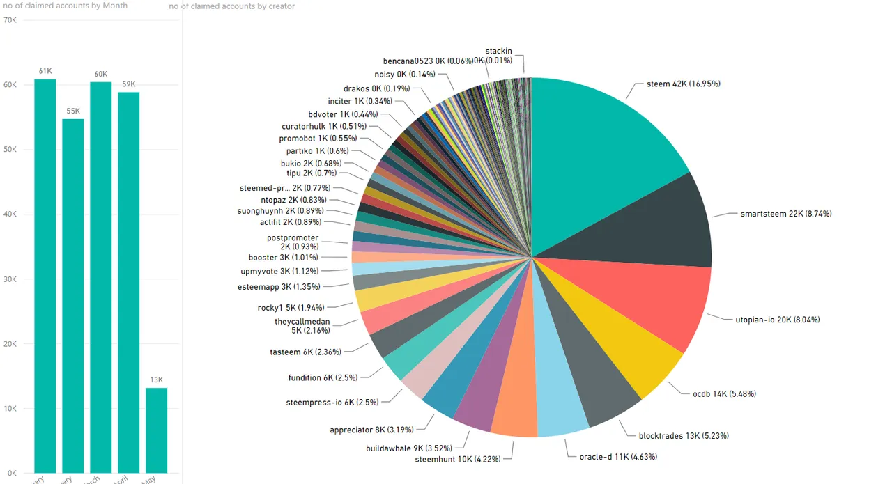 The introduction of account creation tokens in HF20 allows users claim the right to set up an account. In total 59K account creation tokens were claimed in April. Below shows who has been claiming these account creation tokens year to date. We can see Steemit Inc has claimed almost 17% of these, yet they have set up almost 84% of new accounts year to date.