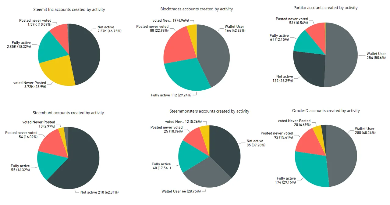 Taking the top 6 account creators, below we can compare the activity levels of the accounts created. @Partiko stands out as having the highest % of accounts that are wallet users only. @Blocktrades and @oracle-d stands out for the highest % of active account. Steemit Inc and @steemhunt stand out with the most accounts that have never become active.