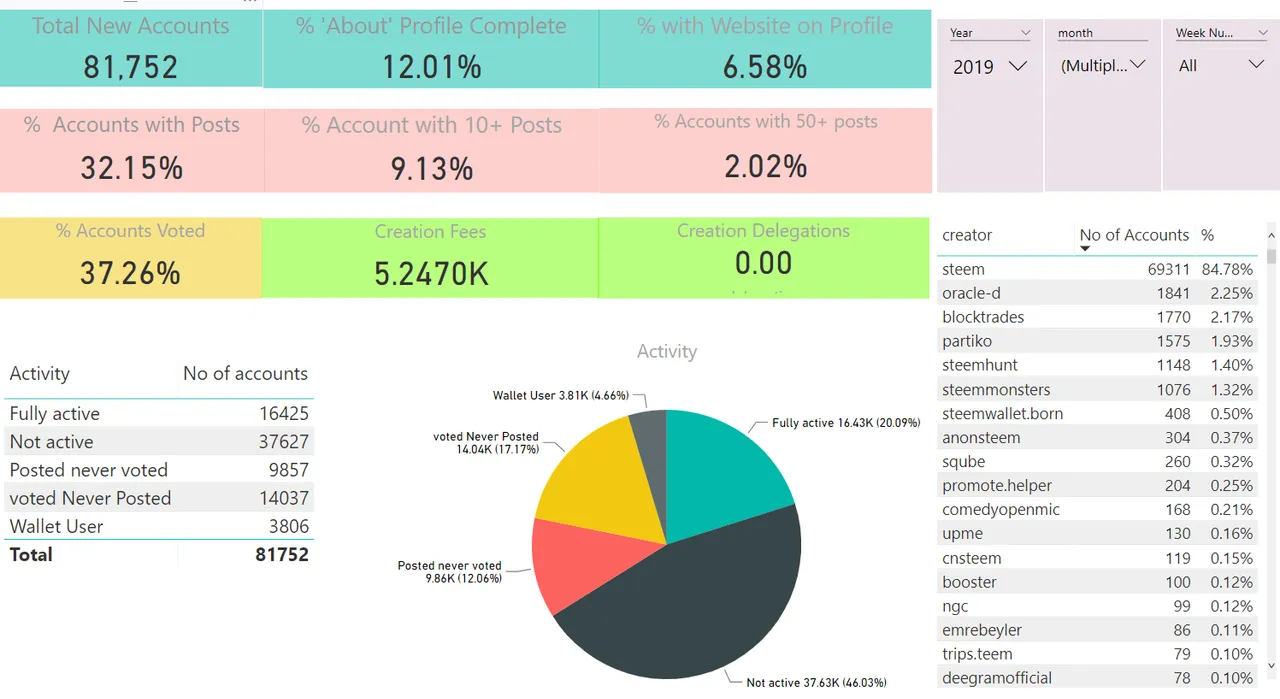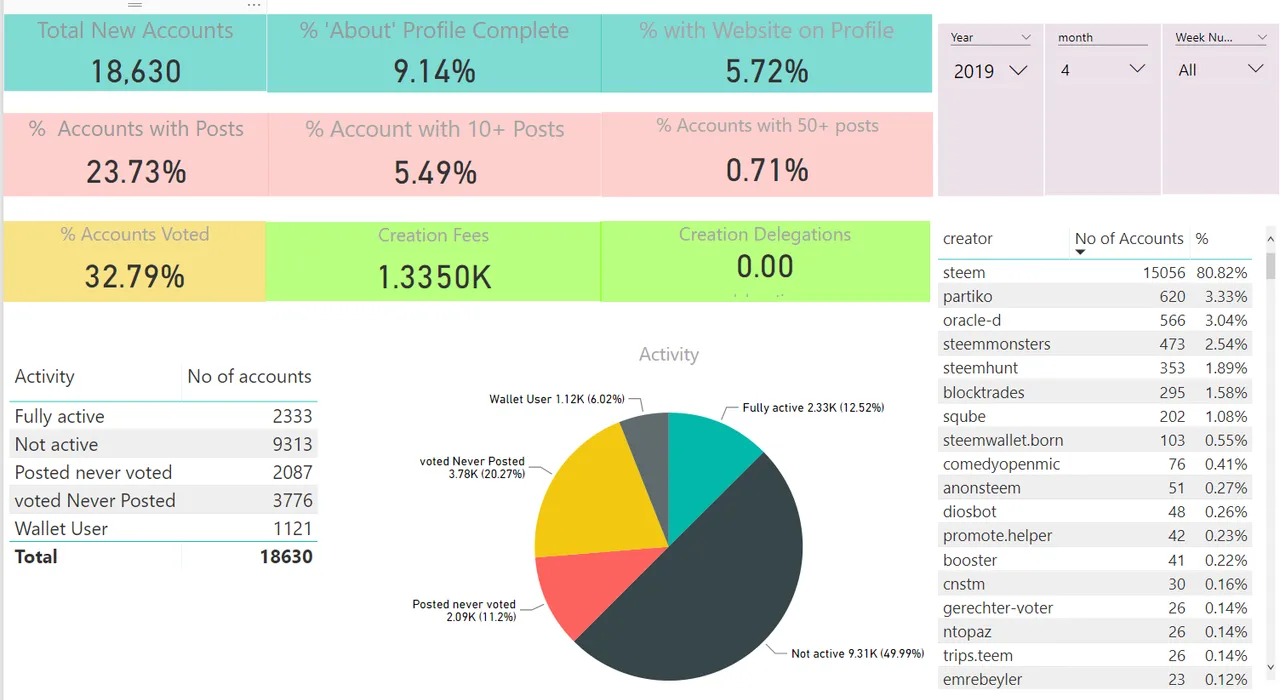 In April 19 50% of accounts created have never transacted on the blockchain via wallets or posts or votes. If we look at all accounts set up in 2019, we can see this is running at about 46.3% for the year to date.