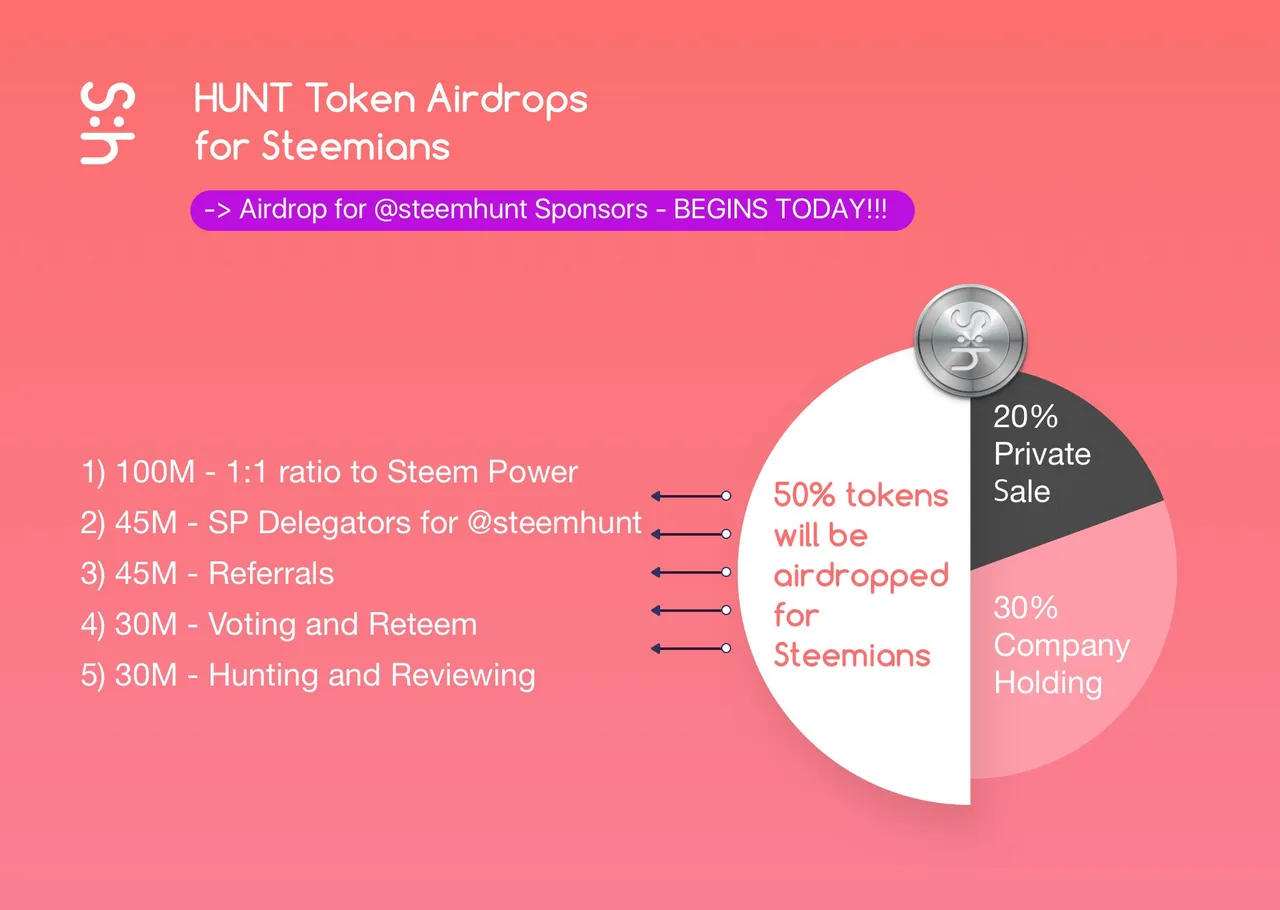 Steemhunt is now acting on the point 1) 100M - 1:1 ratio to Steem Power. Look! 50% HUNT tokens are now being airdropped for Steemians.