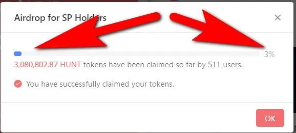 Remember that this is a "first come first get" system. This means that once the 100M HUNT tokens are claimed, there will be no more.