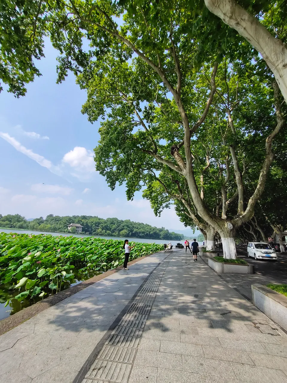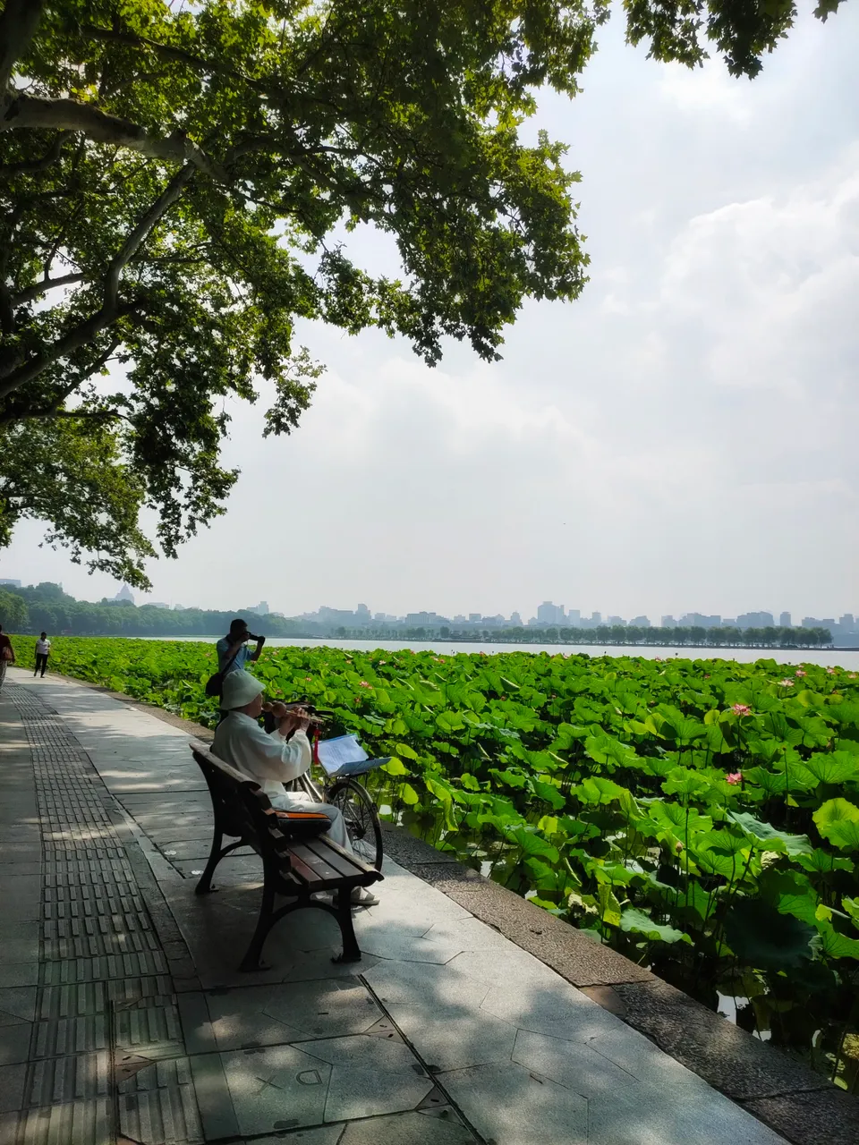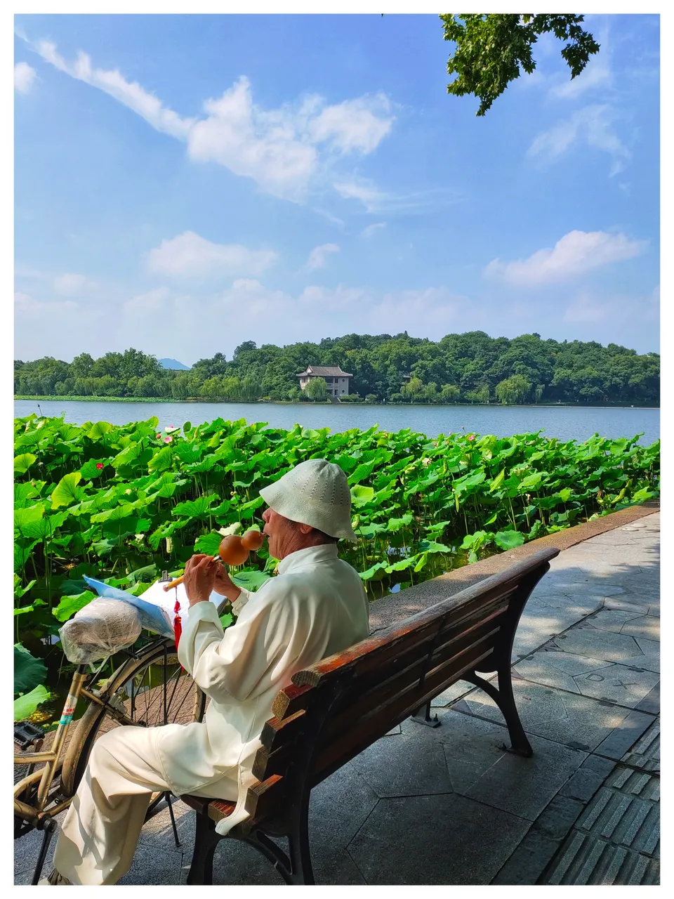 照片中的这位老人骑着自行车,来到杭州西湖北山街,吹起了葫芦丝。